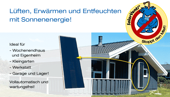 Ein SolarVenti an der Wand oder auf dem Dach fungiert typischerweise als einfache, günstige und wirksame Lösung für ein besseres Raumklima, ganz gleich, ob Ihr Ziel die Lösung oder Verbesserung gesundheitlicher Probleme ist, oder Sie einfach nur die täglichen Unbequemlichkeiten ganz allgemein vermeiden möchten. Ein SolarVenti wird Ihr Haus ohne Wärmeverluste und ohne jegliche Betriebskosten für den Besitzer oder Belastungen für die Umwelt durchlüften. Kostenlose Zusatzwärme ist häufig ein Extra-Bonus.