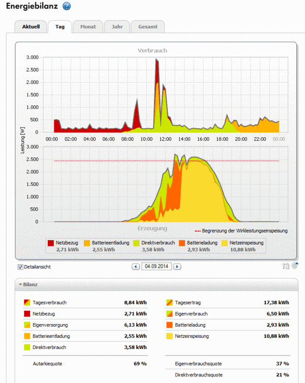 Die Abbildung zeigt ein über 24h nahezu gleichmäßig verlaufendes Verbrauchsprofil eines Privathaushaltes mit einem elektrischen Jahresenergiebedarf von rund 4.400 kWh und die Erzeugung einer 4,2 kWp-PV-Anlage und einem kleinen 2 kW Speicher an einem Sommertag. Der Eigenverbrauch des Tages (grüne Fläche) entspricht dabei der Schnittmenge aus Erzeugung (hellgrüne Fläche) und Verbrauch (rote Fläche). Der Orange Bereich entspricht der Lade- und Entladeleistung des Speichers.